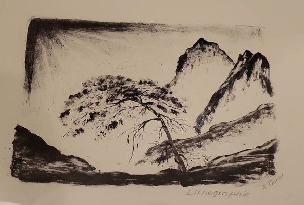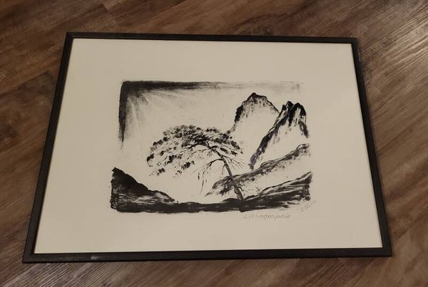 Schwarzweiß Lithografie einer Gebirgslandschaft. Handsigniert von "J. Franke". Das dickere Papier der Lithografie enthält ein Wasserzeichen und ist hinter Glas gerahmt.