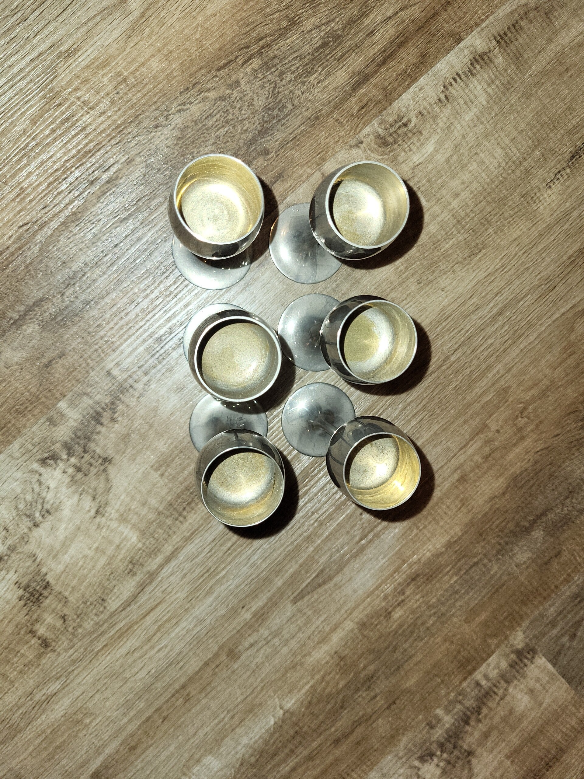 Sechs versilberte Metallkelche aus Messing. Für Likör oder anderes gern Getrunkenes. Von der ehemaligen Metallunion Quedlinburg.
