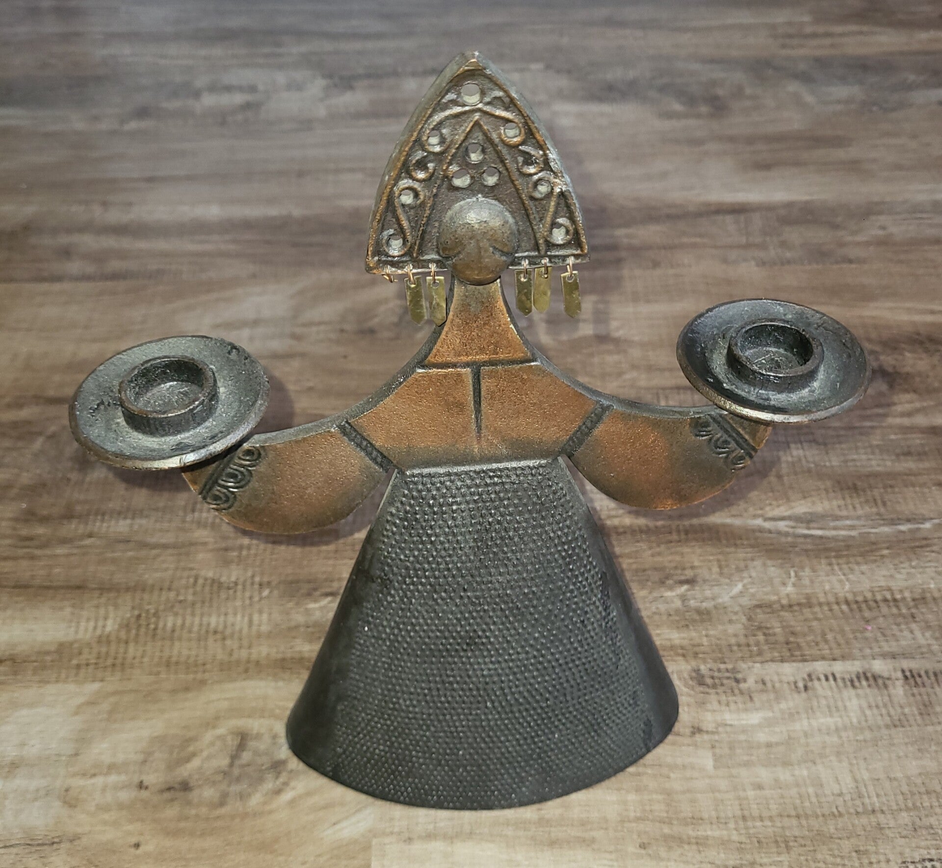 Russischer Kerzenleuchter / Matroschka. Aus Metall. Handgefertigt. Eines der handgefertigten Blättchen, die an der Unterseite des Hutes hängen, fehlt.
