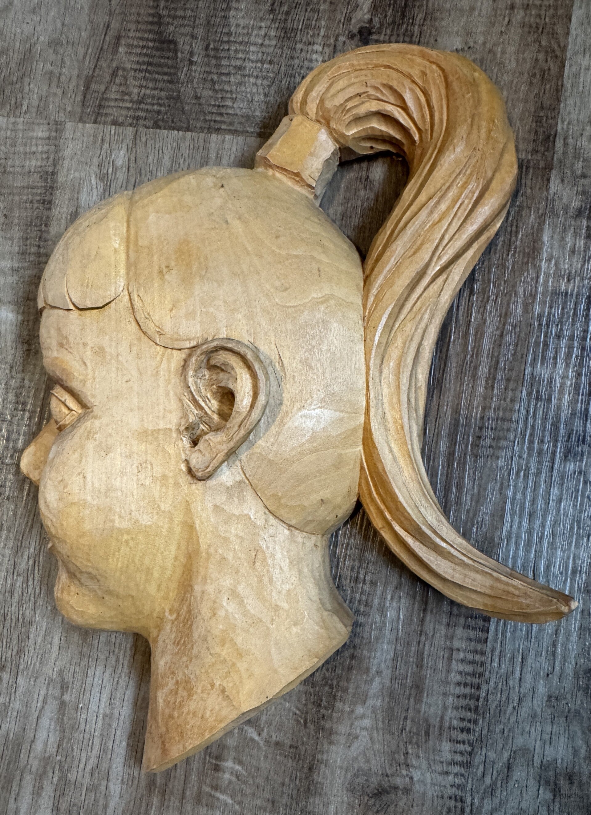 Handgeschnitzte Skulptur / Figur. Zeigt die linke Seite eines Mädchenkopfes. Mit Wandaufhängung. Rückseitige Gravur / Signatur mit "B". Es handelt sich um ein Einzelstück aus den 50er / 60er Jahren. Original Vintage.